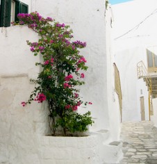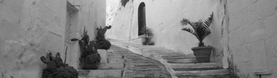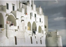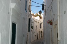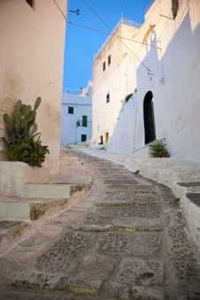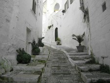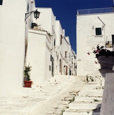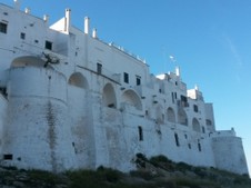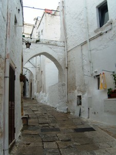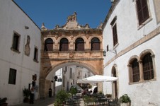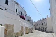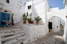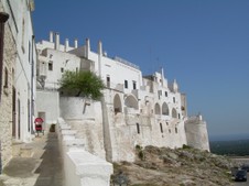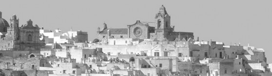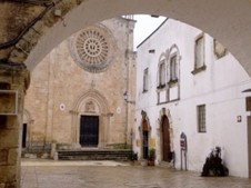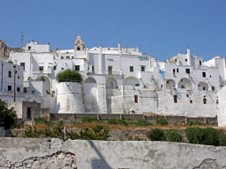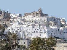 Il comune di Ostuni (circa 33.000 abitanti) sorge sulle ultime propaggini della Murgia meridionale. La sua città vecchia, detta La Terra, è inconfondibile per l’accecante monocroma colorazione del suo abitato, rigorosamente di bianco. Le case tinteggiate di calce e la peculiare topografia hanno fatto meritare epiteti fiabeschi, come Città Bianca, Regina degli Ulivi, Città Presepe, II nucleo antico - probabile supporto dell'acropoli messapica - è infatti arrampicato sui fianchi scoscesi di un colle e presenta una pianta ellissoidale, chiaramente espressa dalla cinta muraria rafforzata dai torrioni aragonesi. Ne rimangono otto dei quindici originari, come pure buone parti dei baluardi che chiudevano la città medioevale. Ostuni è un affascinante groviglio di stradine anguste e tortuose, un susseguirsi di corti, piazzette e vicoli che un tempo facevano capo a cinque porte che si aprivano nella cinta muraria, munite di torri, piombatoi e bertesche. L'unica vera strada che raggiunge il vertice del "cono" e che divide il centro storico in due parti è via Cattedrale, mentre tutte le altre che lo intersecano sono vicoli ciechi o scalinate strette e ripide. Qui si trovano abitazioni cubicolari, spesso scavate nella roccia, unite da archi e semiarchi che fungono da contrafforti e da sostegno; come pure palazzi che, per gli stemmi gentilizi, i portali e la varietà delle linee architettoniche, con macchie d'ocra dorato ombreggiano l'accecante bagliore del bianco labirinto, Sulla sommità del colle, infine, si erge la Cattedrale, mirabile sintesi di elementi romanici, gotici e veneziani, che domina la Piana degli ulivi secolari fino al mare.